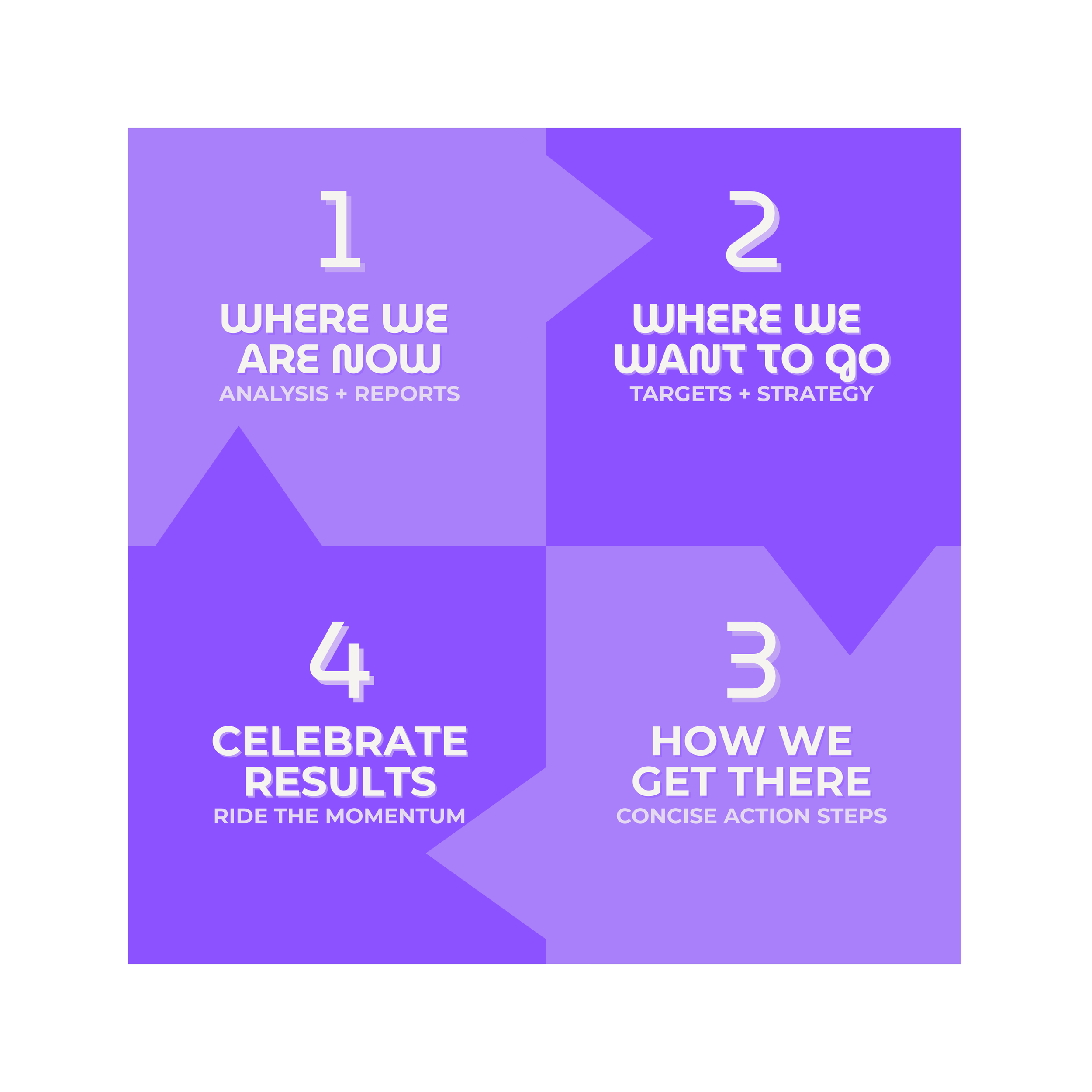 Valuable reporting and forecasting, goal-centered strategic planning, data-driven action plans, and expert advice a phone-call away. All paired with implementation meetings paced to keep you on track.